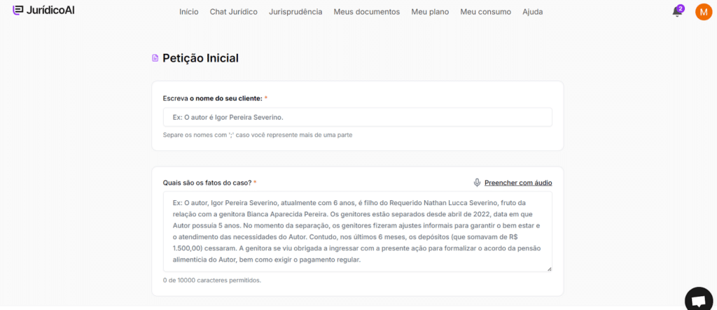 Em seguida, são solicitadas as informações essenciais do caso, como partes envolvidas, resumo fático e fundamentos jurídicos iniciais.