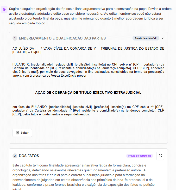 O advogado pode revisar as teses apresentadas e realizar ajustes diretamente na plataforma. Essa etapa é fundamental para validar a aderência do texto aos fatos do caso concreto e à estratégia processual definida.