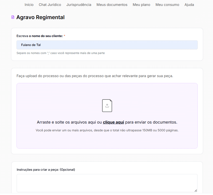 Preencha todos os campos solicitados, como “nome do cliente” e “peça do processo que deseja rebater ou responder”. Não esqueça de fazer upload do processo ou das peças do processo que achar relevantes para gerar sua peça.