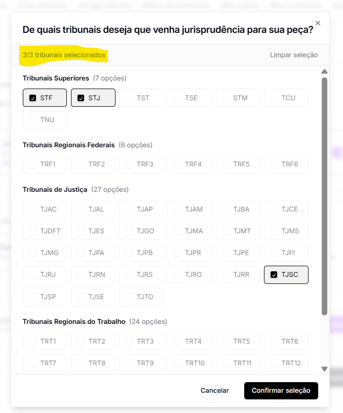 Escolha três tribunais para a IA da Jurídico AI adicionar automaticamente jurisprudência que faça sentido com o caso do seu cliente. Em seguida, clique em “Confirmar seleção”.