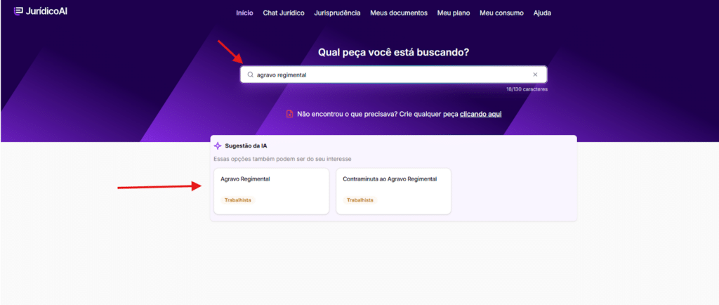 Em seguida, clique na opção indicada pela IA para criar o seu modelo de Agravo Regimental Trabalhista.