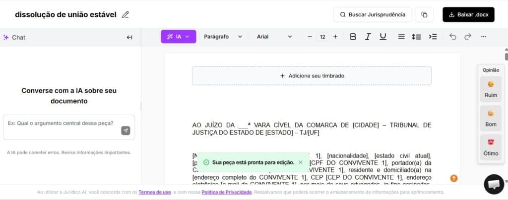 Em poucos instantes, a plataforma disponibiliza a ação de dissolução de união estável estruturada, pronta para a revisão final pelo advogado e posterior utilização.