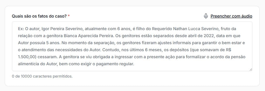 Com o suporte da plataforma, é possível estruturar demandas como divórcio consensual, dissolução de união estável, ação de alimentos, revisão de pensão, partilha de bens, entre outras, sempre com foco na realidade do cliente e nas informações fornecidas pelo profissional.